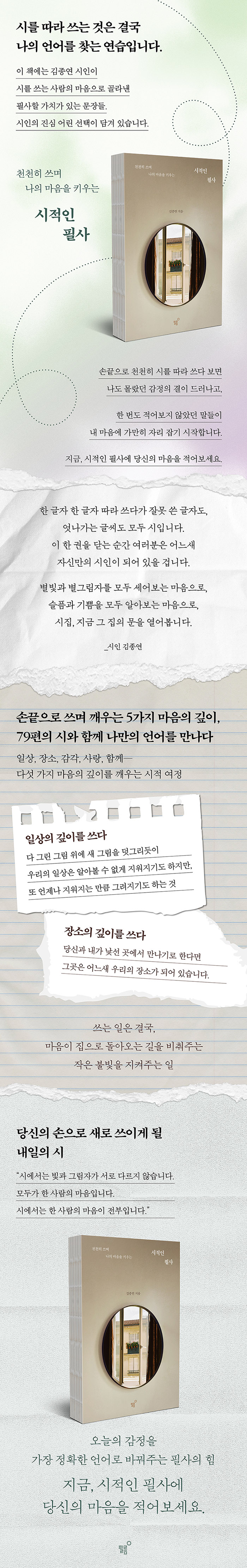 이 책의 특별함은 시인 김종연이 직접 구성한 다섯 가지 테마를 통해 독자가 다양한 사유로 필사에 몰입하도록 돕는다는 데 있다. 각 장을 여는 시인의 산문은 독자가 자신의 문장과 마음을 다시 발견하게 하는 조용한 길잡이가 되어줄 것이다. 무엇보다 시인이 직접 고른 문장들이기에, 한편 한편 따라 쓸 때마다 새로운 세계를 발견하는 경험이 될 것이다. 아울러, 필요한 순간 펼쳐 따라 쓸 수 있도록 자연스럽게 엮여 있어, 소란스러운 일상에서도 더 나은 마음으로 살아가고자 하는 이들에게 시가 잔잔히 스며들 것이다.